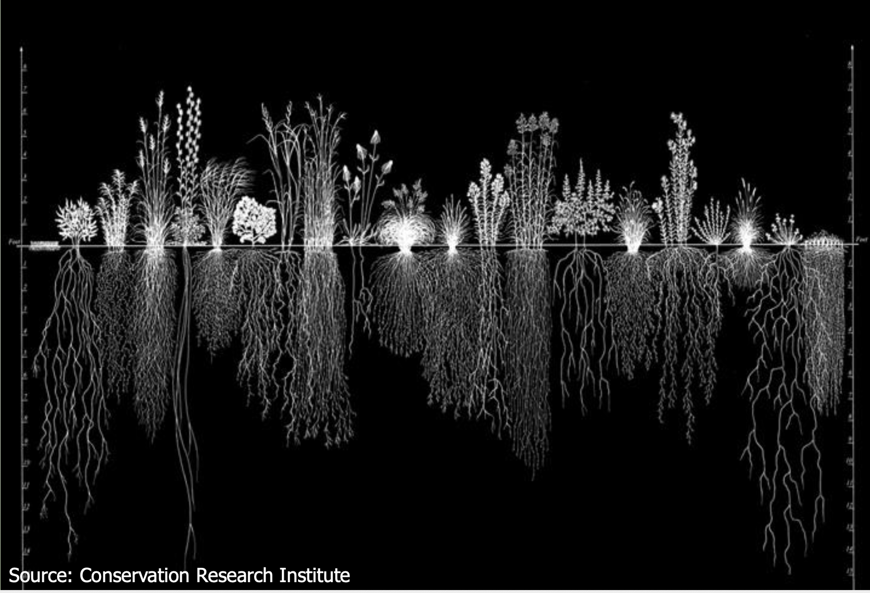 The most productive prairie grasses send roots down 15 to 25 feet. The message is clear: shallow roots are a sign of broken soil. Deep, healthy roots—the key to drought-resistant, self-sufficient plants—are only possible in a living, well-structured ecosystem.
